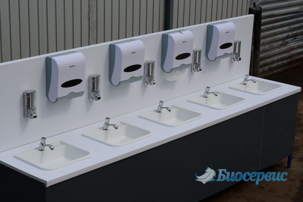 это наша собственная разработка. В едином блоке размещены 5 раковин, оснащенных дозирующими кранами, диспенсерами жидкого мыла и бумажных полотенец.